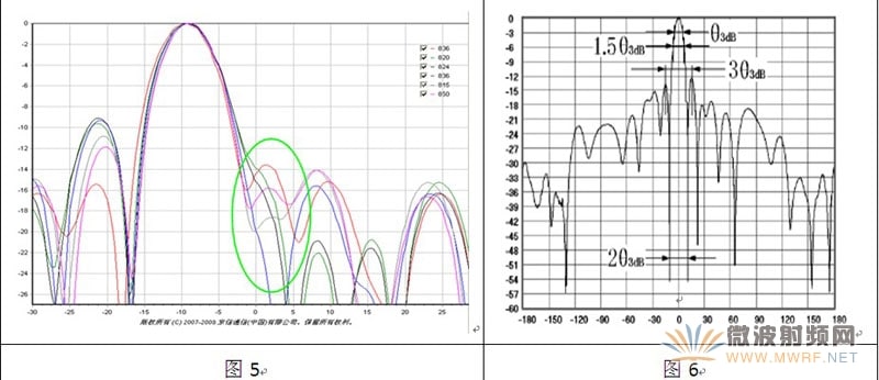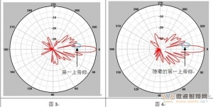 副瓣抑制是天線的重要指標(biāo),目前通常考核垂直面方向圖的第一上旁瓣,如圖3所示。但在一定頻段內(nèi),總有一些頻點的第一上旁瓣很不明顯,似乎未按預(yù)定位置出現(xiàn),容易將第二上旁瓣誤認(rèn)為第一上旁瓣,如圖4、圖5所示,導(dǎo)致指標(biāo)評判錯誤。對此,當(dāng)?shù)谝桓卑瓴幻黠@時,需要在預(yù)定的第一零點和第二零點之間的角域內(nèi)找最大值來確定,通常是1~2倍θ3dB角域,如圖6所示。另外,也可按上側(cè)某個角域范圍內(nèi)的副瓣電平進行評估,如從1倍 θ3dB處~30度范圍內(nèi),這樣既可避免上述情況,也有利于網(wǎng)絡(luò)覆蓋效果。
