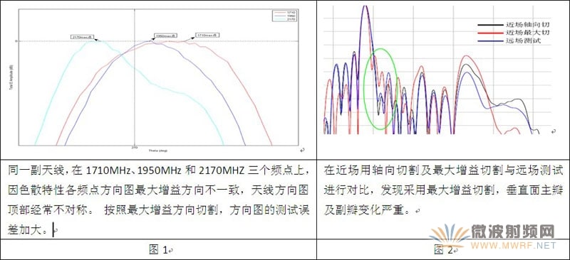 在近場測量沒有投入國內(nèi)移動通信天線測試運營之前,行業(yè)內(nèi)的專家對于上述定義沒有異議。但在近場測量投入測試運營之后,有專家對方向圖的切割基準(zhǔn)有了另外一種說法,即按最大增益方向進行切割。同樣以上面的天線為例,對于不同的頻點,真實的波束水平面最大指向可能發(fā)生在96度,也可能在94度。從立體圖看,Θ=95度的水平面方向圖可能是各種各樣的:對稱的標(biāo)準(zhǔn)圓弧尖頂、圓弧平頂、偏斜一側(cè)或者同時兼有偏斜、馬鞍頂或者多波浪頂,以及各頻點指向的離散性等。同樣,對于垂直面方向圖,如果在最大值所對應(yīng)的Φ角去切割,則會由于波束偏斜的不同、儀表接收值抖動的不同、頻點的不同,帶來Φ角的巨大變化。如下圖1、2所示,按最大增益方向切割方式,天線的測試誤差將會增大。